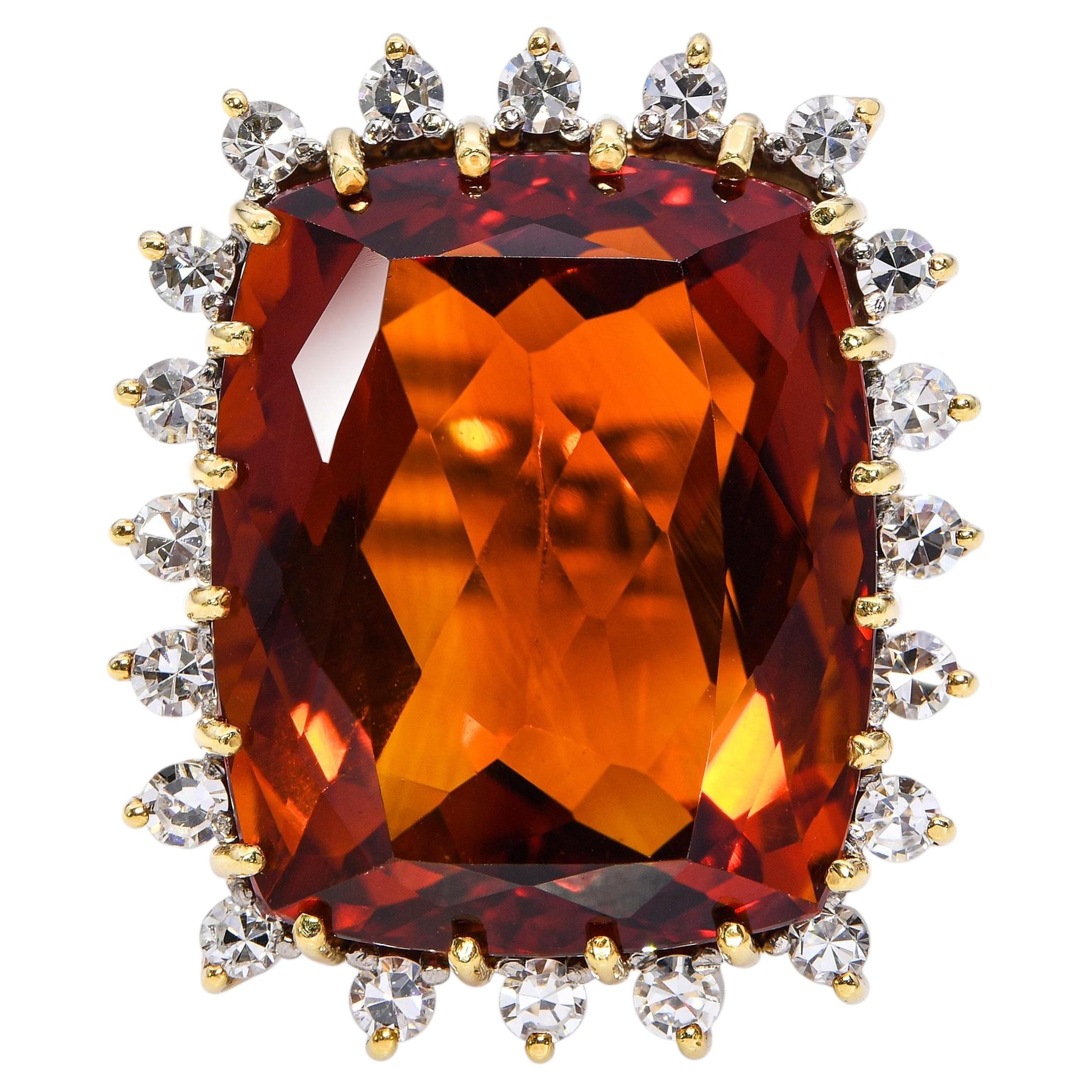 Der Ring verfügt über einen zentralen, facettierten Citrin im Kissenschliff, der von mehreren Diamanten in Krappenfassung umgeben ist. Die erhöhte Fassung ermöglicht einen guten Lichteinfall, wodurch die Struktur und der Schliff der Steine hervorgehoben werden. Die Anordnung der Diamanten bildet einen umlaufenden Rahmen um den Hauptstein.